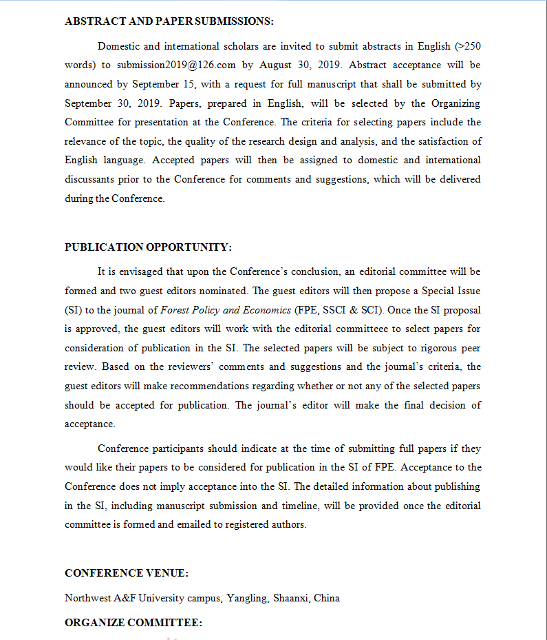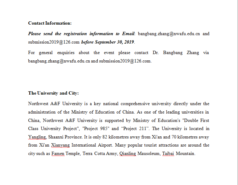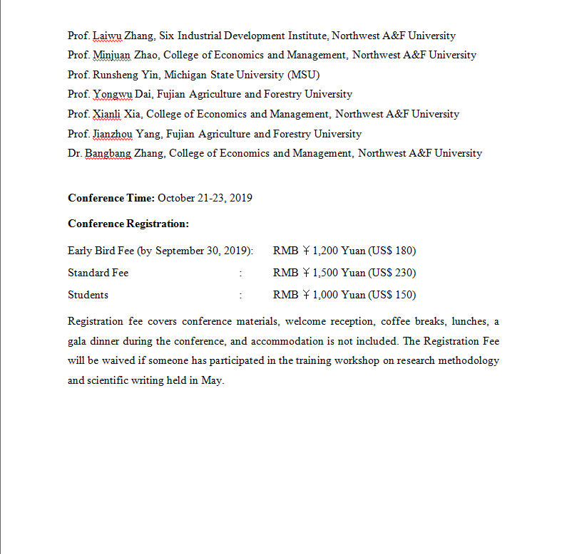 学术活动 您现在的位置: 首页 - 学术活动 马博(中国)举办“2019’ YANGLING International Agri-science Forum on Resource Economics and Rural Development”的通知 上传时间: 2019-08-14 浏览次数: 编辑:0 终审:0 附件: Registration Form.docx 下一篇:马博(中国)举办“2019年度李仪祉讲座系列报告会(十七)”的通知 分享到: